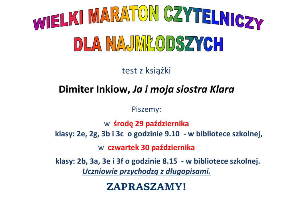 AKTUALNOŚCI, AKTUALNOŚCI BIBLIOTECZNE, DLA RODZICÓW, DLA UCZNIÓW Maraton Czytelniczy dla Najmłodszych – test w październiku 30 września, 2025 Poprzedni PUMPKIN DAY RECIPE CONTEST - KONKURS NA PRZEPIS Z OKAZJI DNIA DYNI Zobacz również Miła niespodzianka w wykonaniu dzieci ze świetlicy – klasy 1. Starannie wykonany plakat z wizerunkiem Babci i Dziadka oraz praca plastyczna. Brawo pierwszaki. 13 lutego, 2019 Świetlica – rozpoczęcie roku 28 sierpnia, 2023 Uwaga! Informacja dla Rodziców uczniów klas I w roku szkolnym 2022/2023 5 lipca, 2022