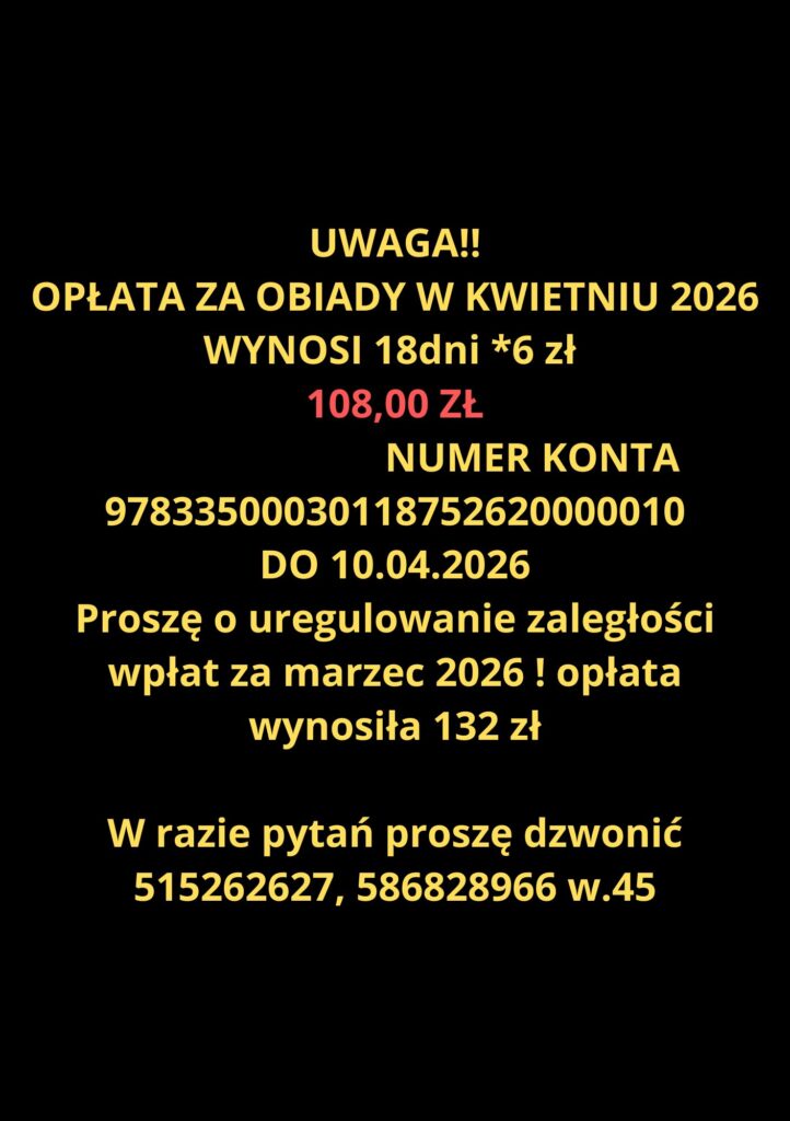 AKTUALNOŚCI, DLA RODZICÓW Przypomnienie – płatność za obiady! 7 listopada, 2025 Poprzedni Zebrania z rodzicami - listopad 2025 Nowsze Wielki Maraton Czytelniczy dla Najmłodszych Zobacz również Zbiórka makulatury od 1 października we wtorki od 7.20 do 10.10 na przerwach. 30 września, 2019 Zaproszenie na Finał Wojewódzkiego Konkursu Wiedzy o Bajkach 1 kwietnia, 2025 Gif Wielkanocny – Ogólnopolski konkurs 13 kwietnia, 2020