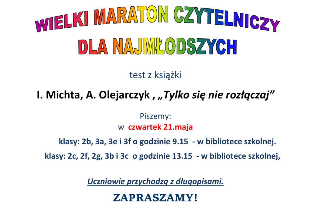 AKTUALNOŚCI, AKTUALNOŚCI BIBLIOTECZNE, DLA RODZICÓW, DLA UCZNIÓW Wielki Maraton Czytelniczy – test nr 6 17 kwietnia, 2026 Poprzedni Test III Finału Powiatowego Konkursu z EDB 2026 Nowsze Zebrania z rodzicami - maj 2026r. Zobacz również Zebrania z rodzicami. 11 stycznia, 2019 Zimowe szaleństwo w sali świetlicowej ☃️🌨️⛄ 11 stycznia, 2019 Szkolny Konkurs Pięknego Czytania 27 stycznia, 2020